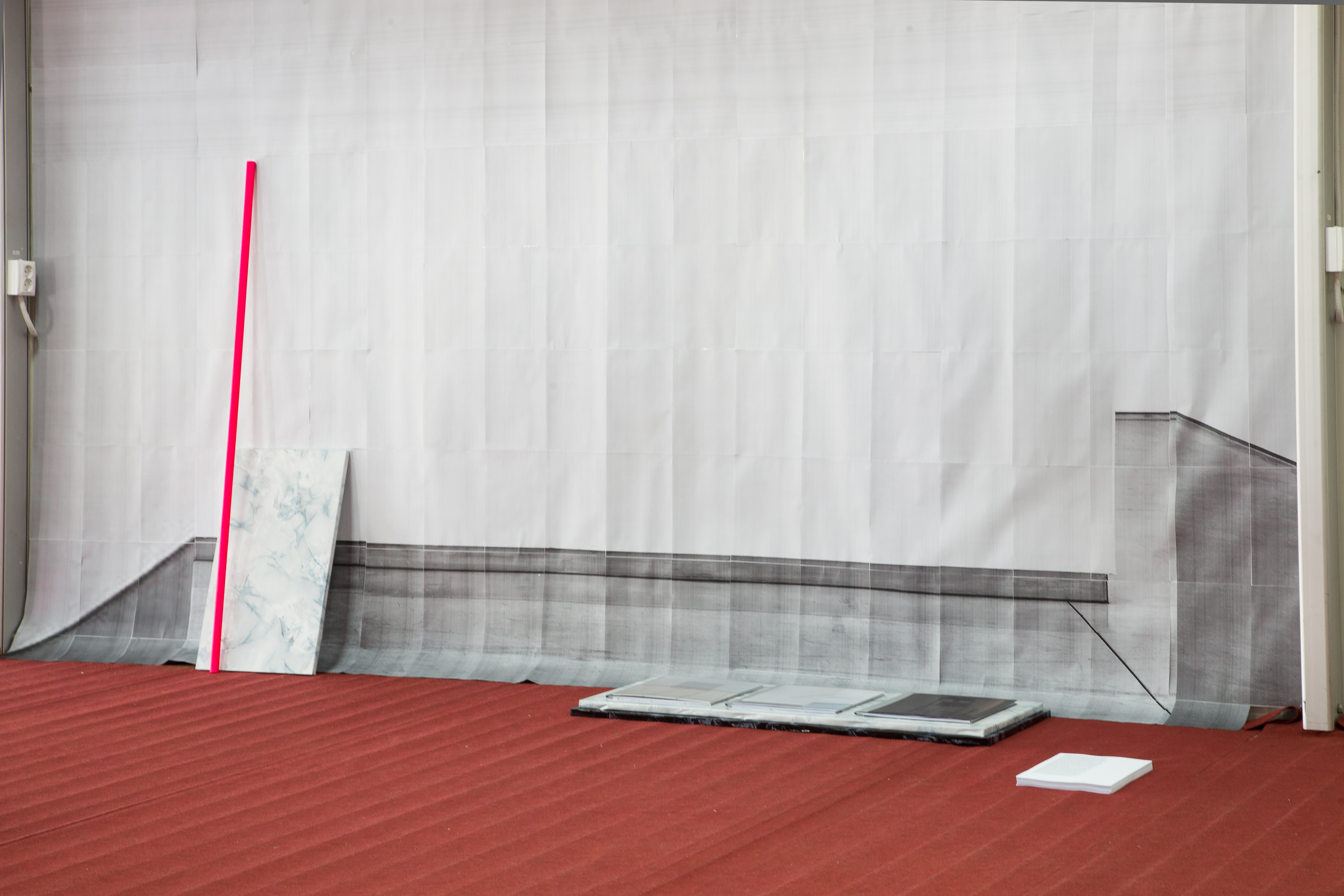 Wallpaper (220 A4 Prints), wood, PVC, imitation marble adhesive foil, fluorescent paint.